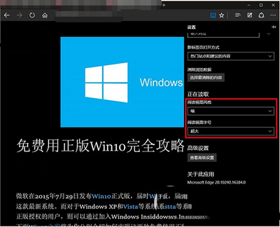 ▲在Edge浏览器设置中,可以调节阅读视图背景色(阅读视图风格)和字号