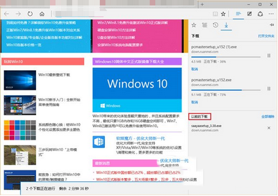 5、下载器 Edge浏览器中的下载器功能较为简单,看起来和IE11有些类似。点击一个可下载的链接后,会在浏览器底部出现一个提示信息,包含下载数量和剩余时间。