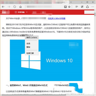 6、询问Cortana 如果你在浏览网页时遇到了不懂的地方,可以在选中相应文字后,点击鼠标右键选择“询问Cortana”。此时Win10数字助手Cortana小娜就会为你解答。