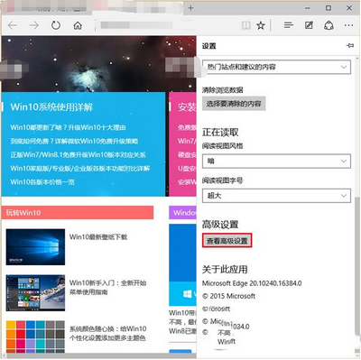 主页的设定需要在“高级设置”中进行,稍显麻烦,但也很简单。习惯使用“主页”功能的用户可以在Edge浏览器设置中,在下方找到“查看高级设置”,点击进入。