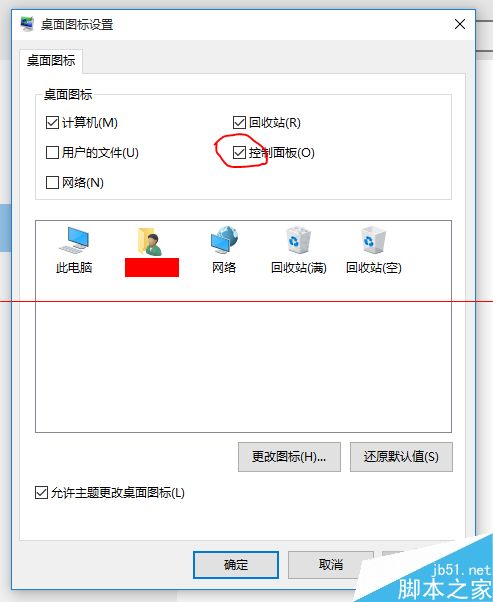 3、在弹出的“桌面图标设置”窗口中勾选“控制面板”,这样“控制面板”就显示在我们的桌面了。