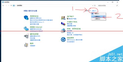 5、在“控制面板”的窗口中,我们在右上角的“类别”里选择“大图标”。