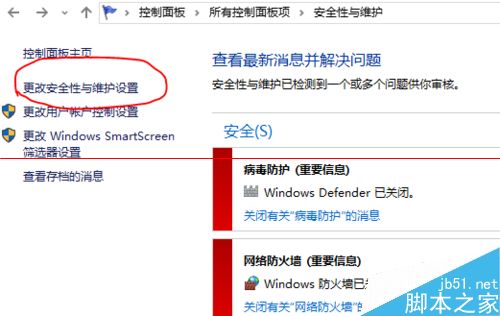 7、在“安全性与维护”的窗口中,点击左边的“更改安全性与维护设置”