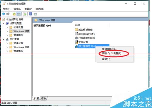 3、在左边找到“windows设置”,左击,然后在右边找到“基于策略的Qos”,右击“基于策略的Qos”,选择“高级Qos设置”,进行如图设置,基本上就没问题了