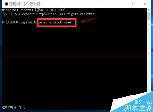 10、在提示框输入netsh winsock reset,回车,如下图所示