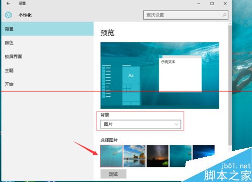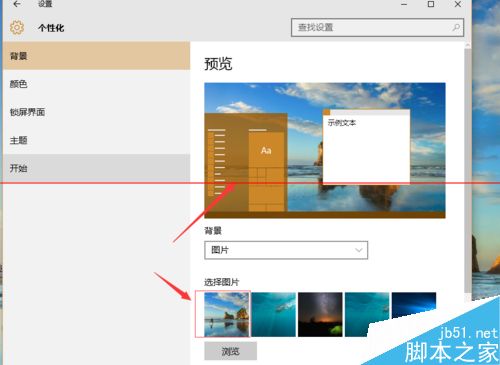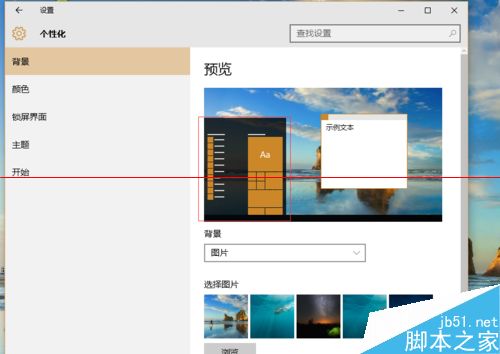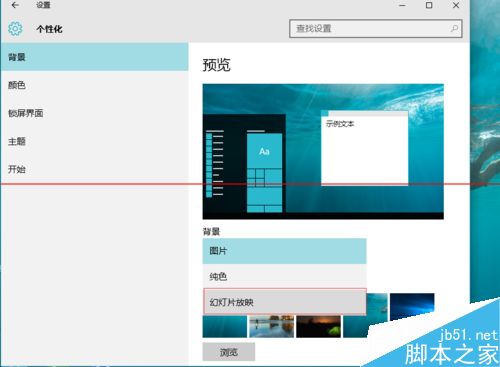 6、如果我们不是想要用单一的图片作为背景怎么办呢?有办法,首先按照第五步将背景图片换成我们想要的那个,开始菜单和任务栏等都变成了我们习惯的颜色,接下来我们将更换图片上面的一个【背景】选项的下拉菜单更改为【幻灯片放映】,下面就会自动由图片换成系统默认的一个桌面背景的“图片”文件夹。我们无需更改这个,当然你也可以把你喜欢的图片放到这个图片文件夹里,系统就会每隔一段时间自动更换桌面背景。
