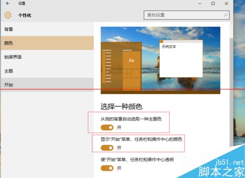 4、我们点击左边的【颜色】选项卡。右侧有一项【从我的背景自动选取一种主颜色】在这个选项下面还有一个选项【显示“开始”菜单、任务栏和操作中心的颜色】如果这个开启那么开始菜单、任务栏和操作中心也会带有背景主颜色的效果。