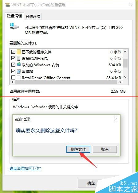 4、然后可以勾选——windows更新——windows安装临时文件——回收站,等一些无用的文件夹,然后选择——删除文件