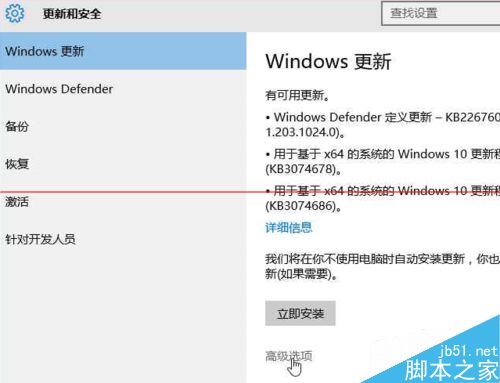 4、在接下来的更新和安全界面里,点击右侧下方的“高级选项”链接。(当然这种方法也可以Windows Insider预览版本怎么暂停更新?)