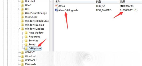 新建DWORD (32-bit)值,并命名为“AllowOSUpgrade”,再将值改为“1”。