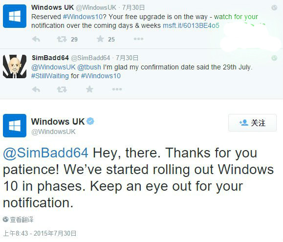 “Windows英国”在其Twitter上公布了该消息,表示Win10正式版推送是分期分批进行,还没有收到推送的用户将在几天到几周之后就会看到相关通知。