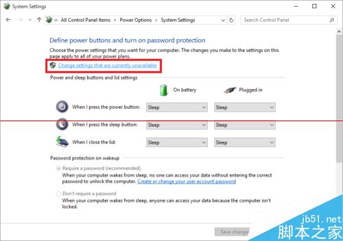 6、选择“更改当前不可用的设置”,勾选下方的“休眠”