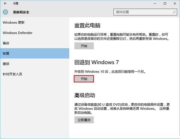 1、打开设置→更新和安全→恢复,找到“回退到Windows7(或Windows 8.1)”,点击“开始”。