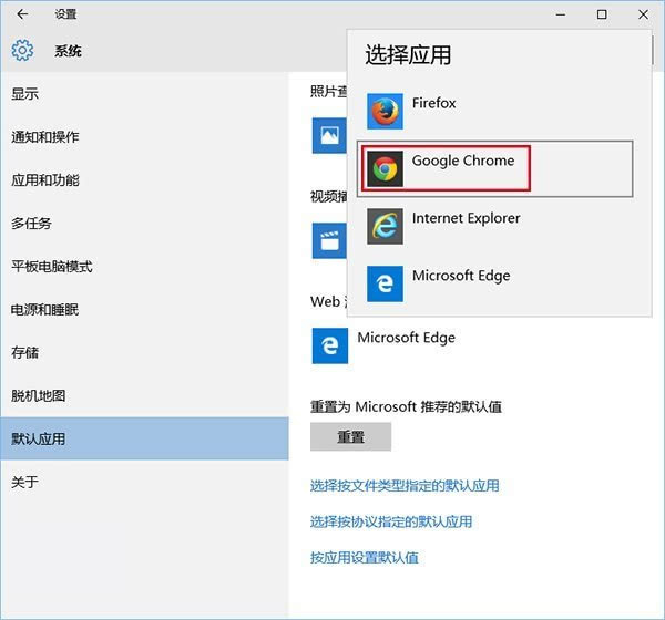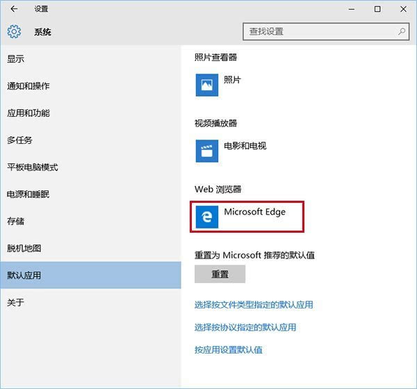 其实不光是默认浏览器的设置,在Win10中,各种默认程序的设置都要通过这一种方式进行。