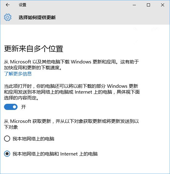 这项设置默认开启,你可以在设置中通过一个开关来接受或拒绝该服务,依次点击任务栏“开始”按钮→设置→更新和安全→Windows更新→高级选项→选择如何提供更新,然后就会看见该选项。选项的说明已经把这项功能介绍的很清楚,上文中也已经提到了基本含义。需要进一步说明的是,在该选项开启状态下,还有一个微调选项,那就是关于更新下载来源的范围选择:本地网络电脑,或者是本地网络电脑以及Internet上的电脑。