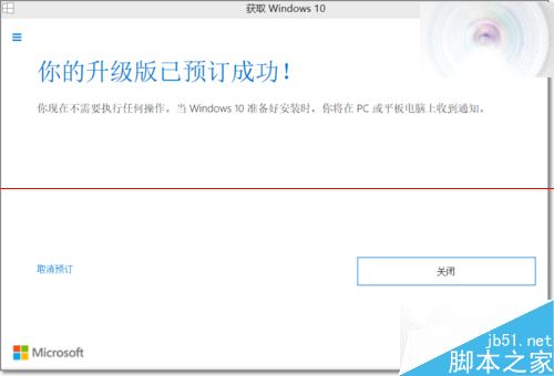5、这里说的不只是查看到升级版预订成功,而在这里可以取消预订。当你检查出你的电脑不适合升级到Windows10,则可以在这里取消预订,这样的就不用升级到Win10了。