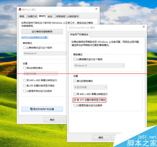 1、找到模糊程序或者快捷方式,右键选择属性,这里以qq的属性为例。点击兼容性选项卡,再点击更改所有用户的设置,把高DPI时禁用显示缩放勾选。如下图: