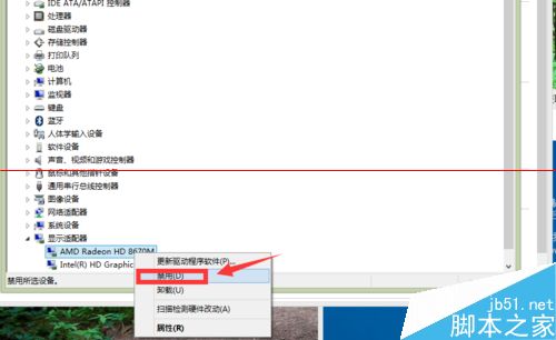 5、右键点击你的显卡列表项次--禁用,如下图所示