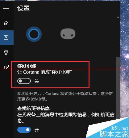 4、接下来,在设置菜单中,我们会看到“让Cortana响应微软小娜”功能处于关闭状态,所以我们点击将该功能按钮开启。