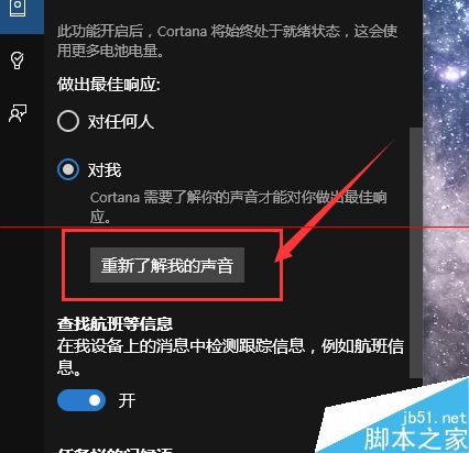 5、该功能按钮开启以后,会让我们设置是让小娜响应所有人的呼唤还是只听你一个人的呼唤,这里我们选择“对我”选项,然后让小娜了解你的声音。