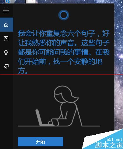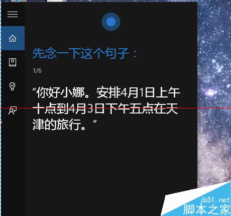 6、然后我们就会进入小娜声音熟悉界面,要想让小娜熟悉你的声音,你必须念六段话,是按照电脑屏幕上小娜让你念的话去念,所以,接下来准备好你的麦克风,同时最好找一个安静的地方哦。