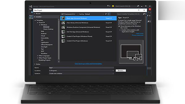 “(VS2015)这套工具包括通用应用模板,代码编辑器,强大的调试器,Win10 Mobile模拟器,丰富的语言支持等等,敬请体验。”