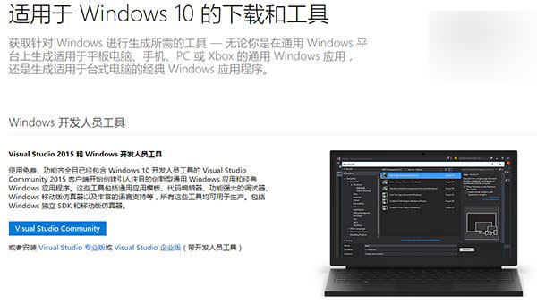 开发者可以选择下载独立的Windows10 SDK,搭配其他第三方开发软件工具,或者直接下载完整版的Visual Studio 2015开发套装。微软表示: