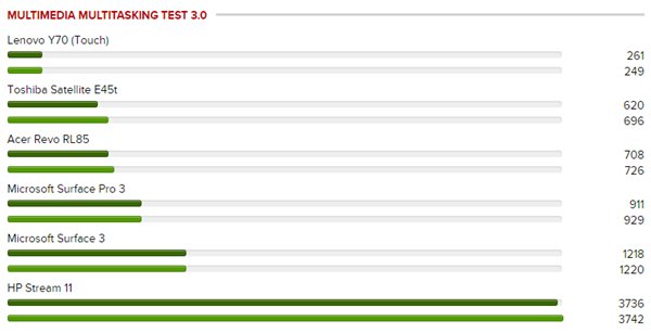 以下是Windows10和Windows8的测试对比情况,横条越短表现越好。(浅绿色是Windows10,深绿色为Windows 8.1)
