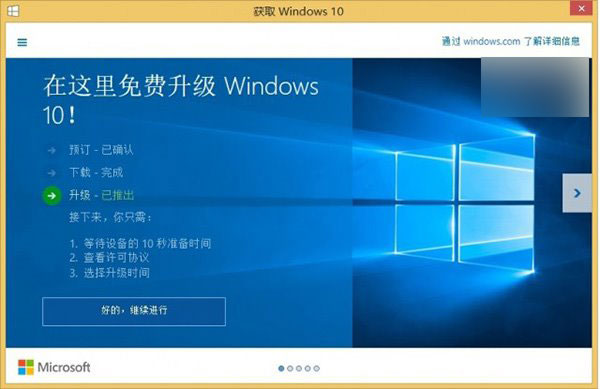 据悉,在完成Win10预下载之后,用户可以通过《获取Windows10》工具继续进行之后的升级安装步骤,点击“好的,继续进行”即可。