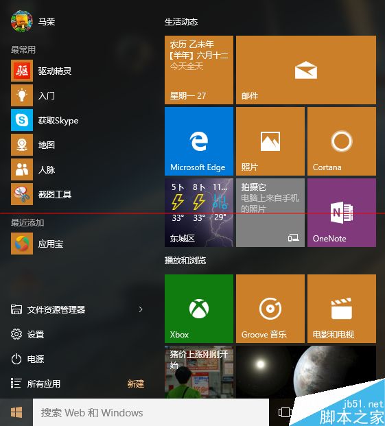 那么重新请回的开始菜单是否打了微软的“脸”呢?在我们看来并非完全如此。在Win10中,微软采用了一种非常圆滑的中庸之道,将以Win7为代表的传统开始菜单元素,与Win8的通用应用(以前叫做Metro)元素进行了整合。所以我们看到的就是下面这个样子的开始菜单。