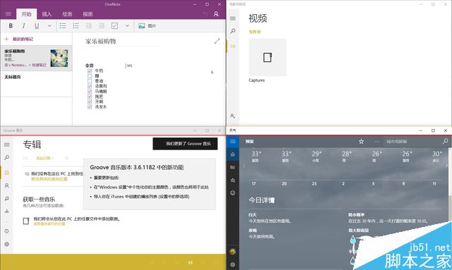 顺便我们再说说分屏系统,在Win10中已经支持四部分屏了,也就是说可以在桌面上最多可以贴靠4款软件。不过这个功能对于桌面来说并没有太大意义,一来它只支持Windows自带的软件和通用应用,并不支持传统软件;二来通用应用都已经支持窗口化可以随意调节大小了,所以分不分屏也没什么必要了。