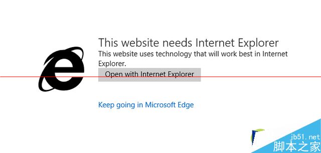 当我们尝试使用Edge打开国内几大银行的官网时,Edge直接显示的就是IE的跳转页面,提示我们使用IE来打开这些网页。