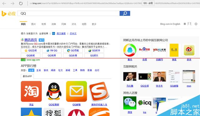 在这里我们可以看到“网页”和“我的资料”两个选项,点击“网页”就会在网页中使用必应搜索与QQ相关的关键字内容,这一点也算是内置了微软自家的必应搜索。