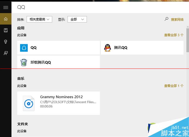 首先,我们还是来看Cortana作为搜索本身的性能如何。我们搜索“QQ”,就会发现给出的搜索结果既有应用、又有文件,还有网页内容。也就是说Cortana继承了Win8的联网搜索,这一点是要胜过Win7的。