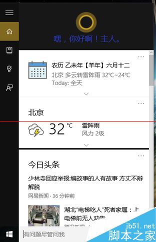 此外,Cortana也支持学习能力,也就是会根据用户的日常使用来逐渐学习用户的喜好、习惯等等,用户只要登录了微软账号就能更加好的享受Cortana提供的服务。比如我们一点开Cortana就能看到天气、新闻、限号信息等等。