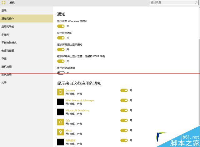 在此我们先来看一眼通知中心的设置界面,这里列出了可以获得通知的项目,包括有关Windows的系统提示以及应用通知。在下放则可以分别设置每款应用的通知开关和通知样式。