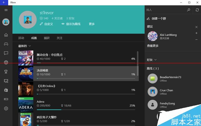 在“Xbox”中继承了原来Win8“游戏”的Xbox LIVE用户中心的所有内容,包括“我的游戏”、“成就”、“Xbox好友动态”、“消息中心”等等,只不过在UI上重新进行了设计,看上去更合理更好上手操作了。