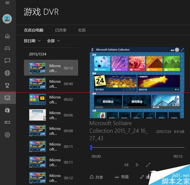保存的视频我们就可以在“游戏DVR”中看到,在这里我们还可以对视频进行简单的剪裁,以及共享、重命名等操作。此外还可以在“社区”中观看其他玩家分享的游戏录像。