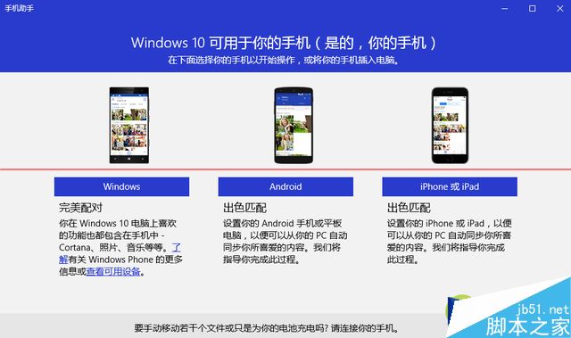 说到手机和平板,事实上在Win10的预装应用中本来就有一个名叫“手机助手”的应用,它可以自动识别匹配Windows手机、Android设备和iOS设备。用户可以像管理一个移动硬盘一样管理接入的手机。