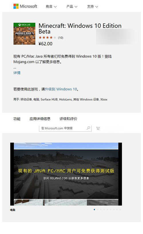 《我的世界:Win10版Beta》商店查看(售价62元),点此链接。