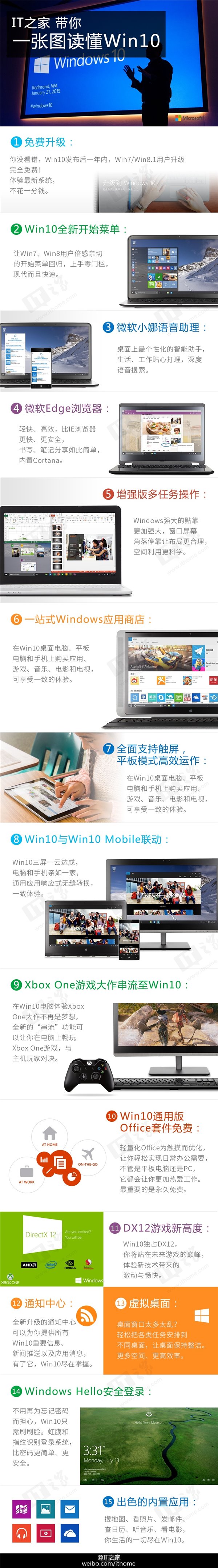微软曾表示Win10将会是最后一个Windows版本,它已经变成一个服务,以后会通过新的升级而得到新的功能。Win10系统在支持跨设备运行、整合OneDrive上表现优异,同时带来了全新的操作中心、Edge浏览器、Windows Hello生物识别技术等,现在就通过下面这张图一起来了解一下吧。
