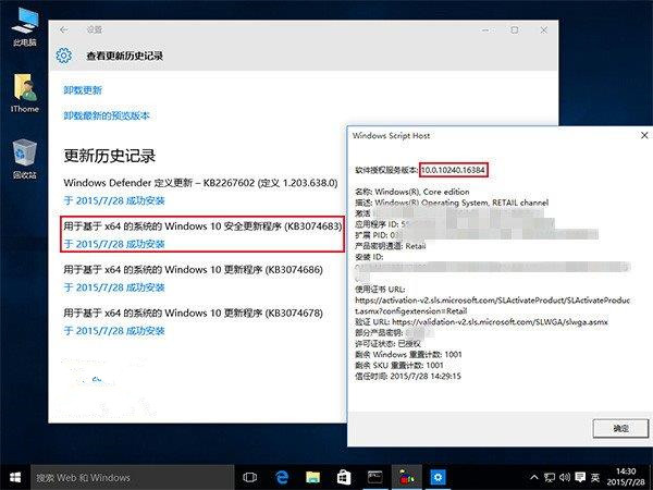 根据外媒消息,安装本次更新后,Win10 RTM版将与7月25日完成编译的10240.16405.150725-1815.th1版本内容保持一致,据说该版本即为7月29日发布的Win10正式版。但经过实际测试后发现,安装KB3074683更新后的Win10软件授权版本仍为10.0.10240.16384,版本号并没有任何改变。