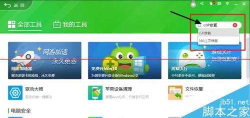 2、在打开的 功能大全 窗口中,右上角搜索:“LSP修复”