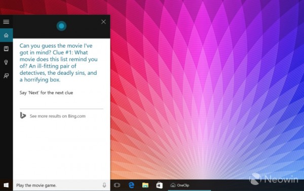 很快,微软就要对外发布Windows 10了,在这套全新的系统中有一个应用是这家公司非常看重的,那就是Cortana。对此,微软希望Cortana能少一些机器感,多一点人性化,于是它在当中推出了一项好玩的游戏--"play the movie game(电影游戏)",它会向用户问一些关于热门电影的小问题。在给出答案之前Cortana最多会给出3条线索。