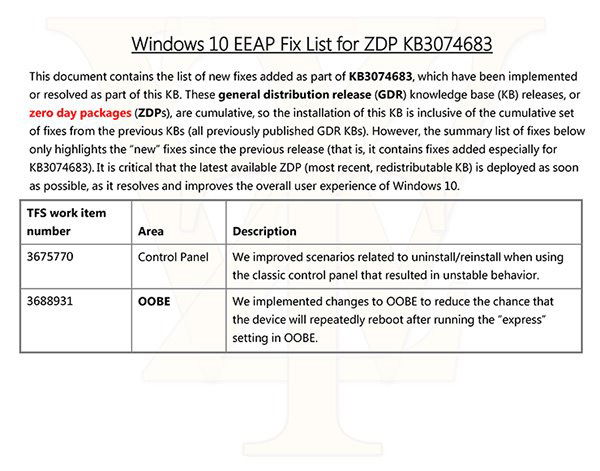 7月28日消息,微软向已安装Win10正式版10240的用户推送了积累性安全更新KB3074683,这项补丁除了包含前几个补丁都涉及的三项安全修复外,还包含了两项功能更新。俄罗斯著名爆料人WZor给出了更新内容。