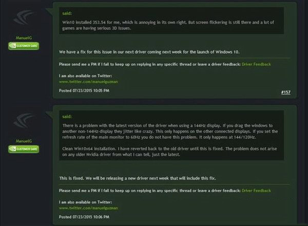 这些情况引述自GeForce论坛的用户发帖,英伟达客服的回应是,新的驱动更新会在Windows 10发布后推出并解决以上问题。
