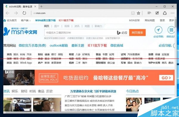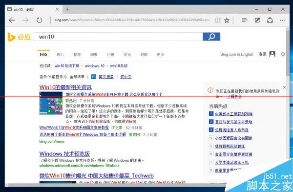 而当点击Edge浏览器时,默认首页为MSN中文网;在浏览器地址栏输入文字时默认为必应的搜索引擎。其中很奇怪的是,默认首页和搜索引擎都不能在Edge的设置中修改,应该是彻底锁定了。