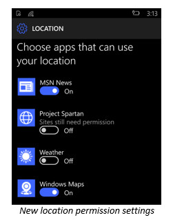 和Windows Phone 8不同,新的Windows 10 Mobile系统将会自动处理一些权限请求,并且给出一个专门的设置页面——用户可在其中更方便地选择每个应用是否允许获取地理位置信息。