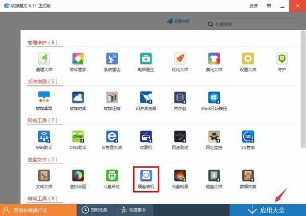1、下载软媒魔方(点此下载),点击右下角“应用大全”,找到“硬盘装机”(也可通过右上角的搜索框找到)。