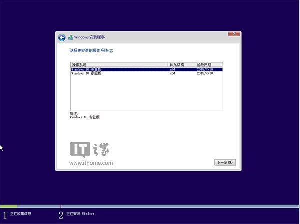 ▲点击“跳过”后会有版本选择窗口,选择你想要安装的版本后点击“下一步”继续。有关Win10专业版和家庭版的区别,请参见《微软公布Win10正式版功能对比表,哪个版本适合你?》